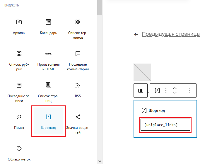 - в шаблоне через визуальный редактор с помощью стандартного виджета "Шорткод" и шорткода [uniplace_links]